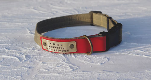 フレンチブルドッグのあんずちゃんの首輪☆ミリタリーコンビレザー ワンタッチバックルのMサイズ 赤色 です。