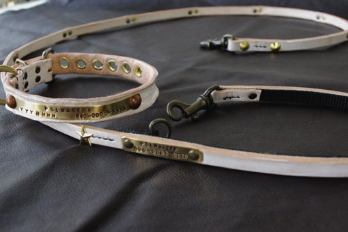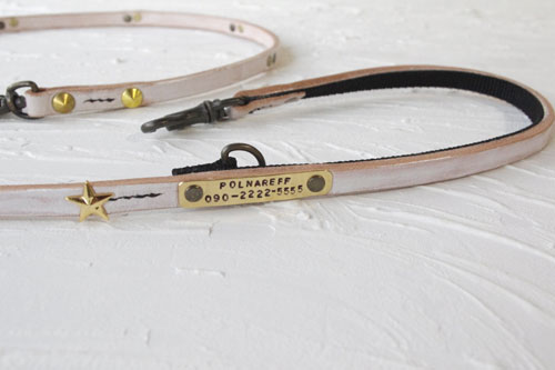 ボストンテリアのポルナレフちゃんの首輪とリード☆かしめ飾りアンティークホワイト バックルМサイズ