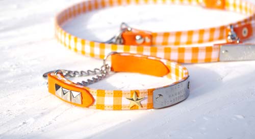 ☆スタッズ付 チェック×レザー リード カフェタイプこのハーフチョークは両サイドにピラミッドスタッズを