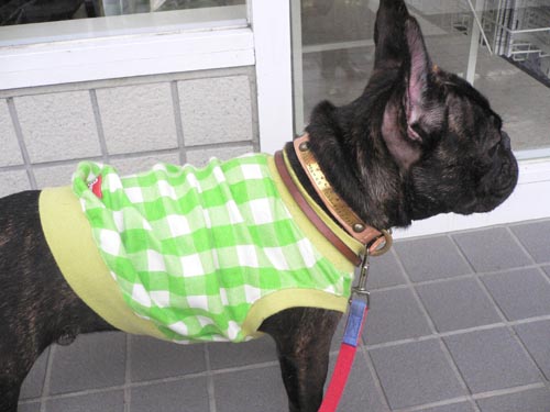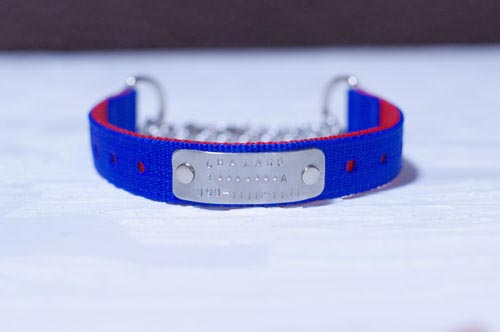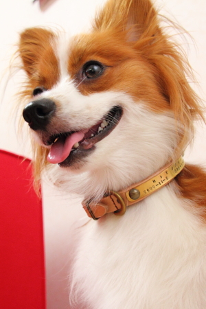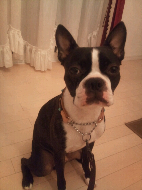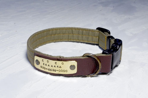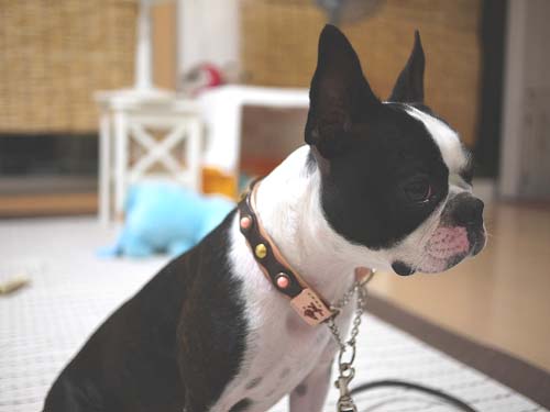 ボストンテリアのぼりょきちくんとおとめちゃん用の首輪と2頭引きリードです。 ■3トーンレイヤー革 ハーフチョーク Мサイズ